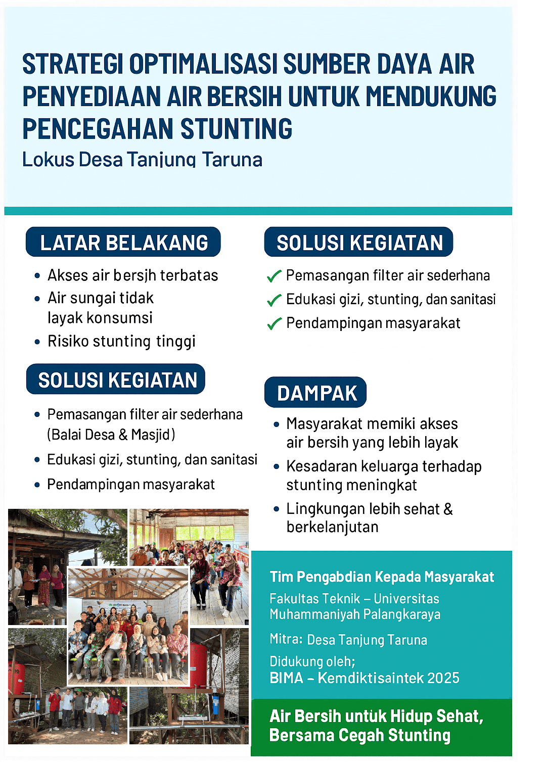 Kegiatan ini merupakan bagian dari Hibah Program BIMA (Bina Desa Mitra Akademisi) yang didukung oleh Kementerian Riset, Teknologi, dan Pendidikan Tinggi (Kemenristekdikti) dengan mengusung semboyan “Diktisaintek Berdampak”. Program ini bertujuan menghadirkan solusi nyata melalui pendekatan keilmuan dan inovasi teknologi yang aplikatif untuk menjawab tantangan masyarakat, khususnya dalam penyediaan air bersih.